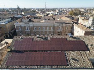 È costituito da 156 pannelli con potenza nominale di 320 wp (watt di picco), di colore rosso, in accordo con la Soprintendenza, per consentire la sua integrazione con i coppi storici di copertura del teatro. L’installazione dei pannelli fotovoltaici è stata realizzata sulla falda sud con struttura portante di alluminio posta in aderenza al tetto, senza interferire con i coppi, per una superficie complessiva di circa 300 metri quadri, che consente di non vedere i pannelli dalla strada. Per ridurre i rischi di incendio, i pannelli fotovoltaici sono certificati in classe 1 di reazione al fuoco, secondo la normativa italiana Uni 9177, mentre gli inverter e le batterie sono stati installati all’interno di un locale del sottotetto, costituente compartimento antincendio. Le stringhe dei pannelli fotovoltaici sono collegate a due inverter trifase con potenza di 10 kw e a due inverter ibridi per la ricarica in corrente continua di due pacchi batterie da 29 kwh, per complessivi 58 kwh. L’installazione è avvenuta nel rispetto delle normative di sicurezza, con installazione di una linea vita per consentire la manutenzione dei pannelli, delle norme di prevenzione incendi e delle norme Cei sugli impianti elettrici.